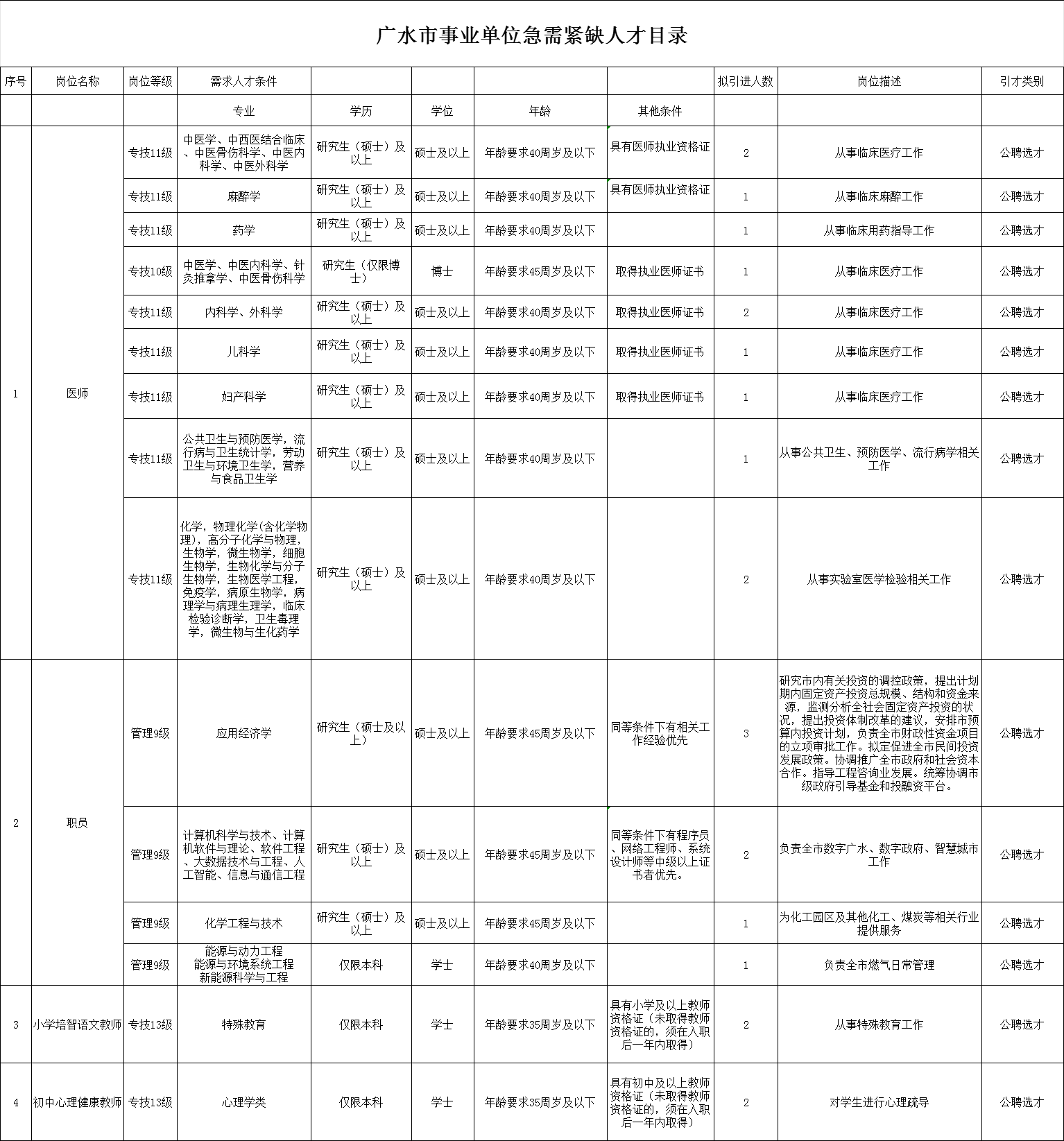 广水市企事业单位急需紧缺人才目录