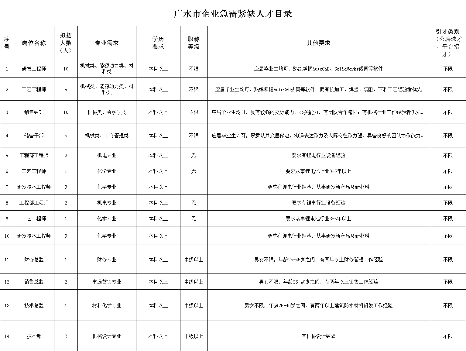 为贯彻落实《关于加快聚集人才优势 打造百强县市的若干意见》(“人才十条”)精神,为深入实施新时代人才强市战略,有效引导各类人才在我市重点企事业按需流动,实现“精准引才”。经审定,现将《广水市2023年度急需紧缺人才目录》予以发布。本目录使用期限为2023年7月1日至2024年6月31日,用人企事业单位在使用期内引进符合目录条件的人才,可以享受“人才十条”政策。